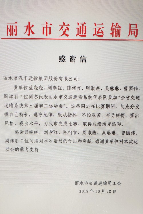 2019年10月24日,麗汽集團(tuán)藍(lán)曉曉、劉李紅、曾國(guó)偉等員工參加浙江省交通系統(tǒng)第三屆職工運(yùn)動(dòng)會(huì),本屆運(yùn)動(dòng)會(huì)麗水市交通局代表隊(duì)共派出28名運(yùn)動(dòng)員,其中麗汽運(yùn)動(dòng)員7名。