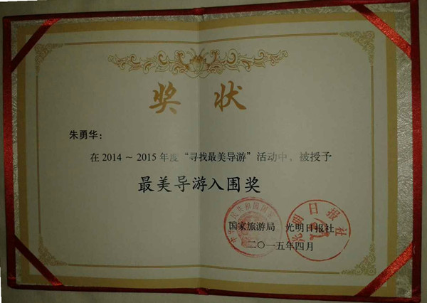 朱勇華是麗水市首屆金牌導(dǎo)游,麗水市首批五養(yǎng)技能大師,并曾榮獲金牌導(dǎo)游大賽“最佳才華獎(jiǎng)”、2011年“古堰畫鄉(xiāng)”杯導(dǎo)游技能大賽二等獎(jiǎng)。